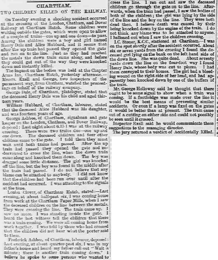 Henry Dale, the great-great-uncle of Nigel Horne, was born in Chartham, Kent, England c. Aug 18671,2,3,4,5,6 and baptized there at St Mary's Church on Aug 4, 1867. On Apr 2, 1871, he lived in Chartham Hatch, Kent, England8 which is where he died on Dec 7, 18803,5. He was buried at St Mary's Church in Chartham on Dec 13, 18807.