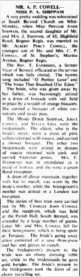 Phyllis Shipham, the wife of Albert Percy Cowell (the first cousin once-removed on the mother's side of Nigel Horne), was born in Westhampnett, Sussex, England on Jul 14, 19141 and. She married Albert (an upholsterer with whom she had 1 surviving child) in South Bersted, Chichester, Sussex, England on Jun 6, 19382. On Sep 29, 1939, she lived on 65 Highfield Road, Bognor Regis, Sussex.