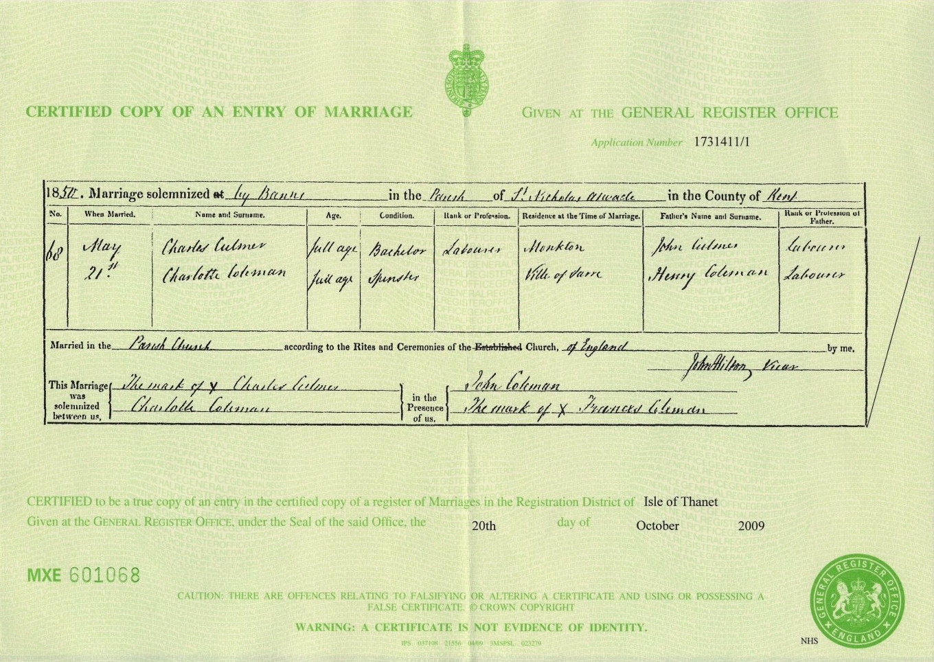 Charles Culmer - Charlotte Coleman - marriage certificate