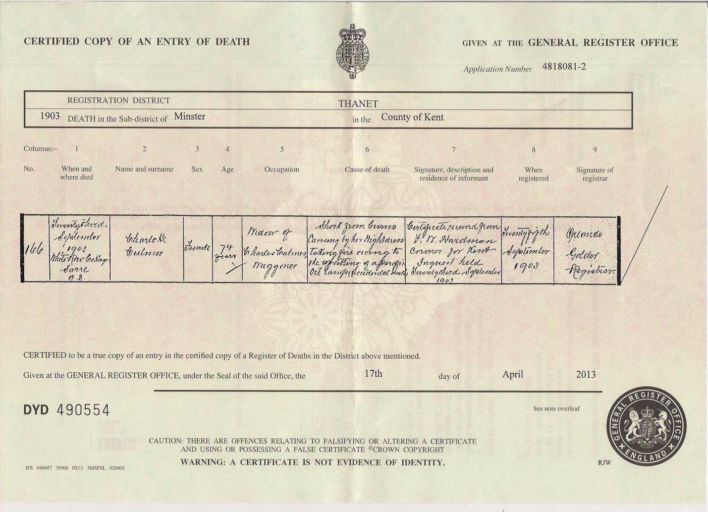 Charlotte Coleman, the great-great-grandmother of Nigel Horne, was born in Sarre, Kent, England c. 18291,2,3,4,5,6,7,8, was baptized there on May 22, 1829 and married Charles Culmer (a farm waggoner with whom she had 9 children: Ann, Henry, Charles, Elizabeth, Emma, John, George, Jane and Frances) in St Nicholas-at-Wade, Kent, England on May 21, 18509 (St. Nicholas At Wade, Kent, England).