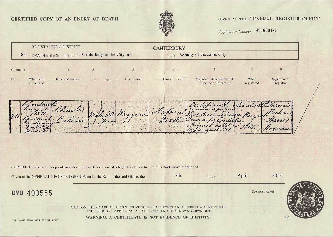 He died on Aug 17, 1881 on Kent and Canterbury Hospital, Ethelbert Road, Canterbury, Kent6 (pleurisy) (pleurisy) and was buried in St Nicholas-at-Wade on Aug 21, 1881.