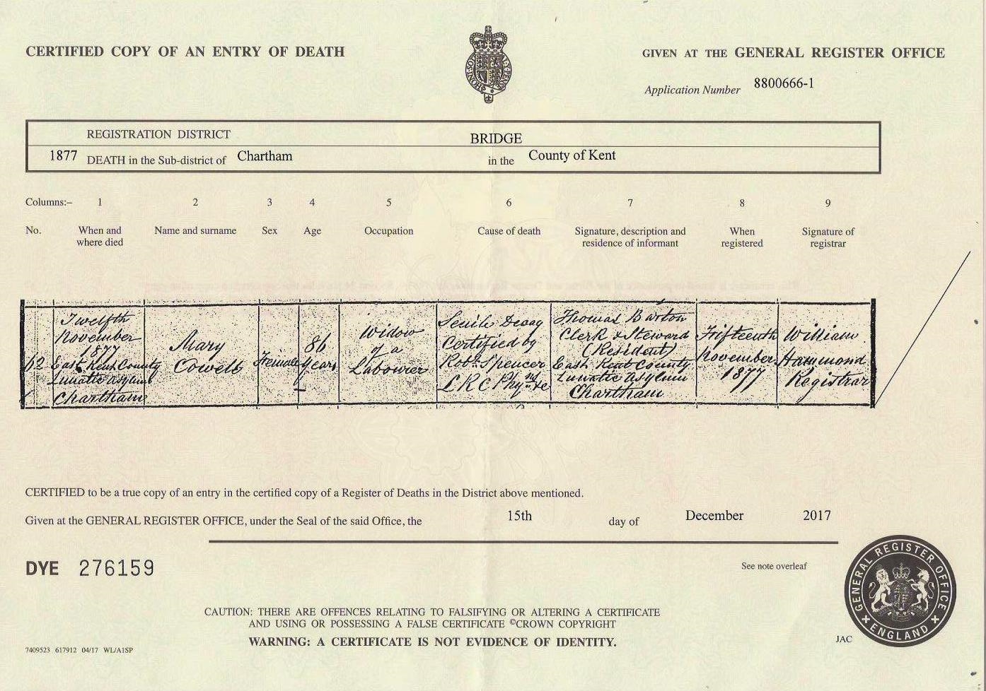 Mary spent all of her life in Kent, England. Throughout her life, she lived in several places around the county: in Wingham Well, Kent, England on Jun 6, 184111; at Old Farm House, Wingham on Mar 30, 18519; at Wingham Street, Wingham on Apr 7, 186110 and in 18714; and in hospital at East Kent County Lunatic Asylum, Chartham, Kent from May 27, 1875 to Nov 12, 187712 which is where she died on Nov 127 (senile decay) (senile Decay).