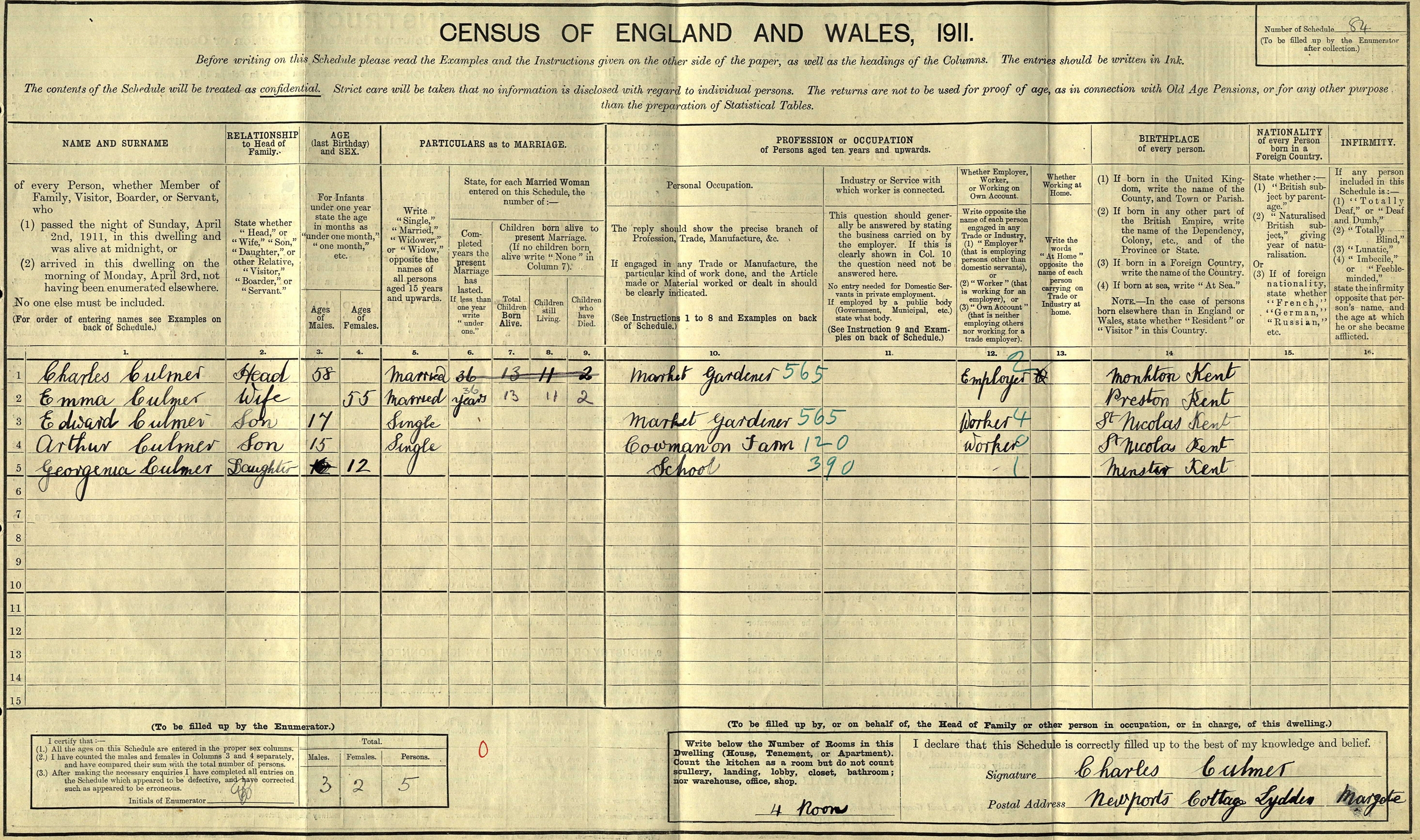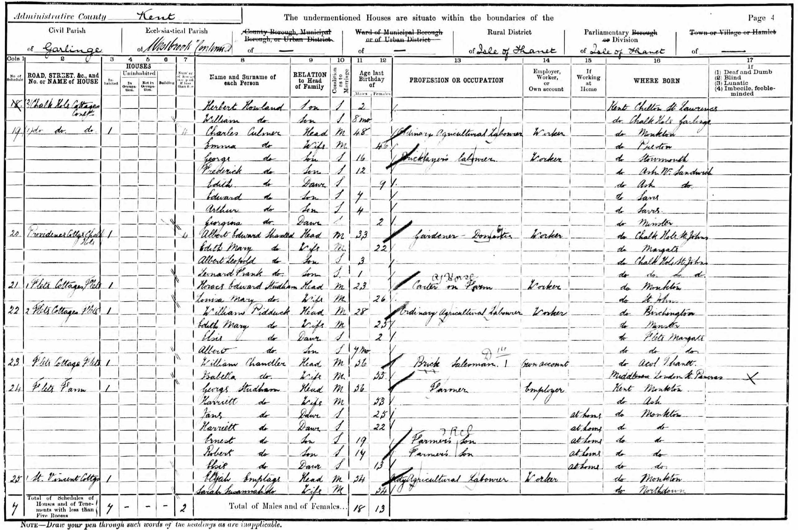 Charles spent all of his life in Kent, England. Throughout his life, he lived in several places around the county: at Monkton Street in Monkton on Apr 7, 18611; on Monkton Parsonage, Monkton Street in Monkton on Apr 2, 187113; at The Square, Stourmouth on Apr 3, 188112; in Westmarsh on Apr 5, 189110; at 1 Chalk Hole Cottages, Flete on Mar 31, 19019; and at Newport Cottage, Lydden Farm, Garlinge on Apr 2, 19115.